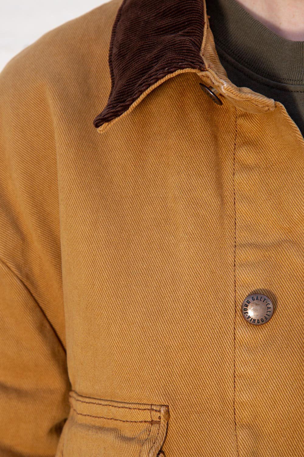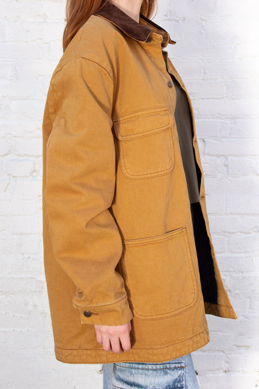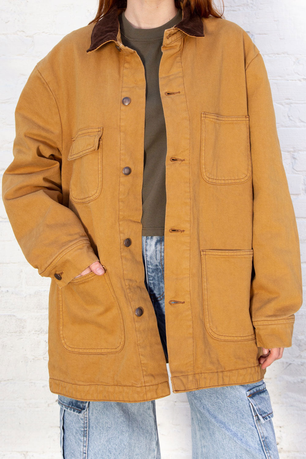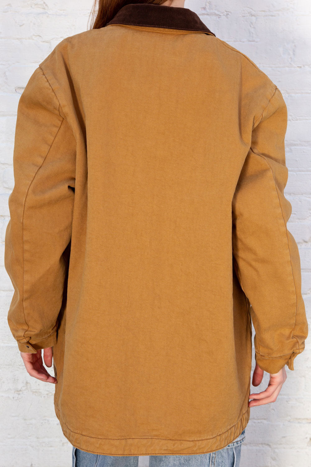 Oversized button up denim jacket with shearling lining inside, a brown corduroy collar, and two pockets on each side of the chest.